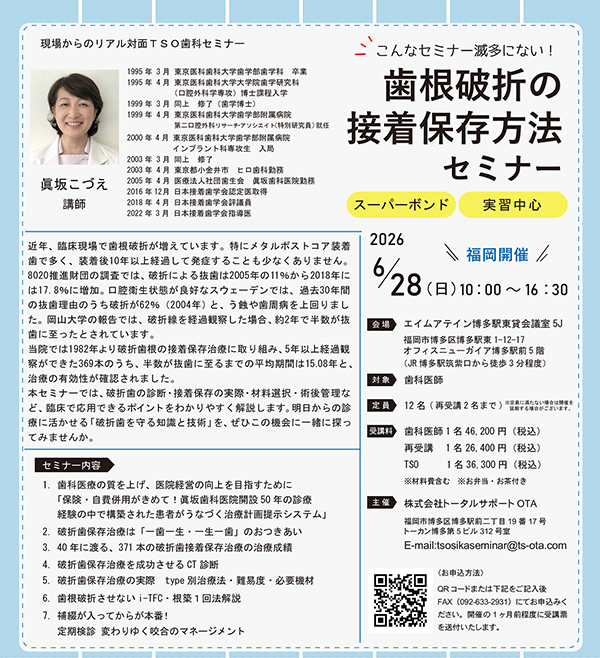 本セミナーでは、破折歯の診断・接着保存の実際・材料選択・術後管理など、臨床で応用できるポイントをわかりやすく解説します。明日からの診療に活かせる「破折歯を守る知識と技術」を、ぜひこの機会に一緒に探ってみませんか。 |