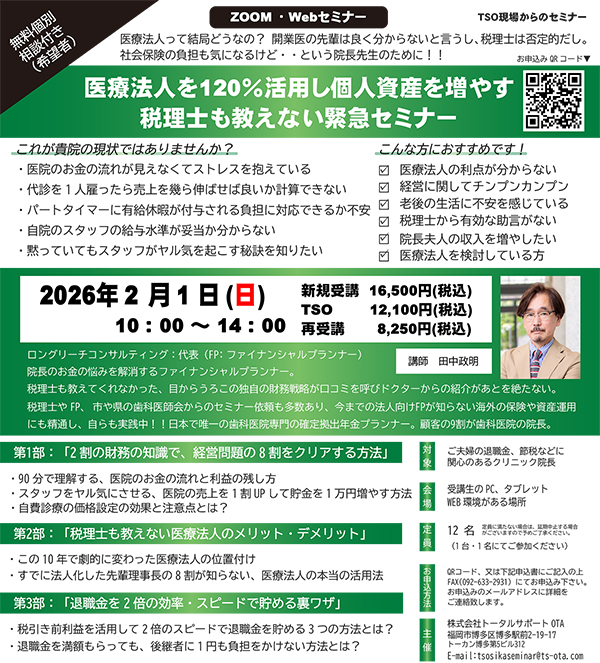 税理士も教えてくれなかった、目からうろこの独自の財務戦略が口コミを呼び、ドクターからの紹介があとを断たない。顧客の9割が歯科医院の院長。