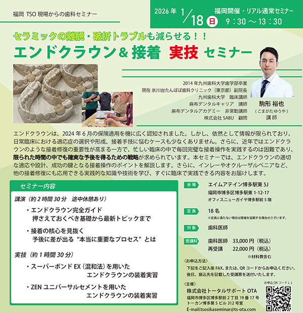 ウンのような接着修復の重要性が高まる一方で、忙しい臨床の中で毎回完璧な接着操作を実践するのは困難であり、限られた時間の中でも確実な予後を得るための戦略が求められています。本セミナーでは、エンドクラウンの適切な適応や設計、成功の鍵となる接着操作のポイントを解説します。さらに、インレーやオクルーザルベニアなど、他の接着修復にも応用できる実践的な知識や技術を学び、すぐに臨床で実践できる内容をお届けします。