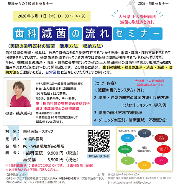 | 歯科領域の機械・器具は、極めて特殊なものが多数存在することから洗浄・消毒・滅菌・収納方法もきわめて困難をきたしています。通常歯科医院で行っている方法では質保証に問題が発生することもわかっています。今回、機械器具の洗浄・消毒・滅菌に長年携わってこられた上人豊田歯科の滅菌担当者より現場からの取り組みや流れなどをセミナーとして開催致します。この機会に是非、歯科の機械・器具の洗浄・消毒・収納方法をご理解いただき、日常業務に活かしていただけますと幸いです。 |