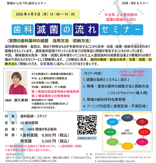 | 歯科領域の機械・器具は、極めて特殊なものが多数存在することから洗浄・消毒・滅菌・収納方法もきわめて困難をきたしています。通常歯科医院で行っている方法では質保証に問題が発生することもわかっています。今回、機械器具の洗浄・消毒・滅菌に長年携わってこられた上人豊田歯科の滅菌担当者より現場からの取り組みや流れなどをセミナーとして開催致します。この機会に是非、歯科の機械・器具の洗浄・消毒・収納方法をご理解いただき、日常業務に活かしていただけますと幸いです。 |